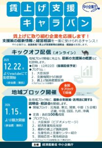 経済産業省 中小企業庁は、賃上げに取り組む企業を応援しており、「賃上げ支援キャラバン」事業を行なっております。 この事業では、最新の賃上げに関する施策の説明とともに、各地域における説明会では支援機関との個別経営相談会も併 […]