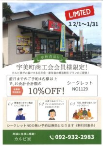 ”とり焼肉 カルビ家”より、宇美町商工会の会員様限定で、忘年会・新年会の特別割引プランがご提供されています。 前日までに4名様以上でご予約された場合、お会計合計額の10%が割引されます。ご予約される際は下記のチラシに記載 […]